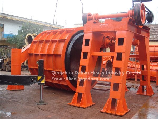 This machine uses the Roller to support the concrete pipe mould, and produce the roller force to concrete in the mould. When the roller rotate at a high speed, the concrete in the mould will spread in the inner wall of the pipe mould and form a cement pipe with the centrifugal force, and when the mould with the inner concrete pass on the roller, the concrete between the mould and the roller will be compacted solid to form a pipe.